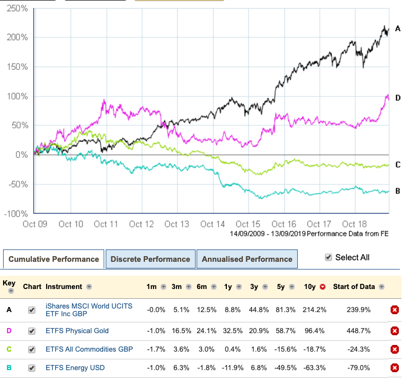 That’s right, it went down. Subsequently the ETFS Energy ETC lost -9.5% annualised (-12.5% real), the worst performer of all in this review.
