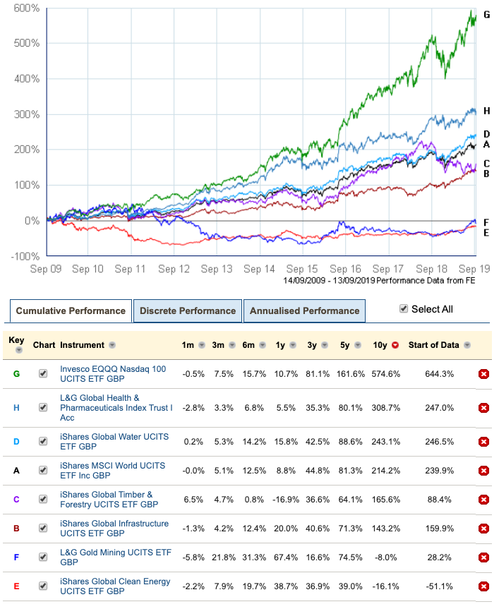 There was also a demographics story. Aging global populations required expanding health spending and that meant a bright future for big pharma and other medical companies. Hmm, yes, well everybody knows that, so what’s the point? 15.1% annualised returns over a decade is the point. See grey-blue line H on the graph and score another win for the future-gazers who took a position in L&G’s Global Health & Pharmaceuticals Index Trust.