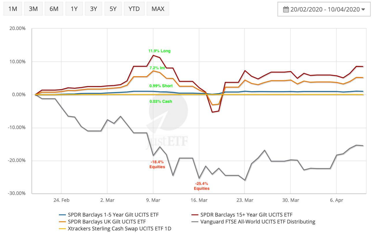 The chart shows gilt ETFs peaking in unison on 9 March 2020. The longer their maturity, the higher they surge: