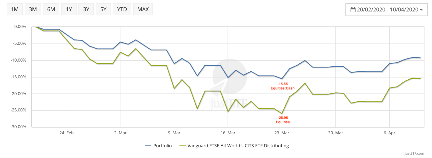 When global equities hit bottom on March 23, a 60:40 portfolio (blue line) was in much better shape than a 100% equities portfolio (green line):