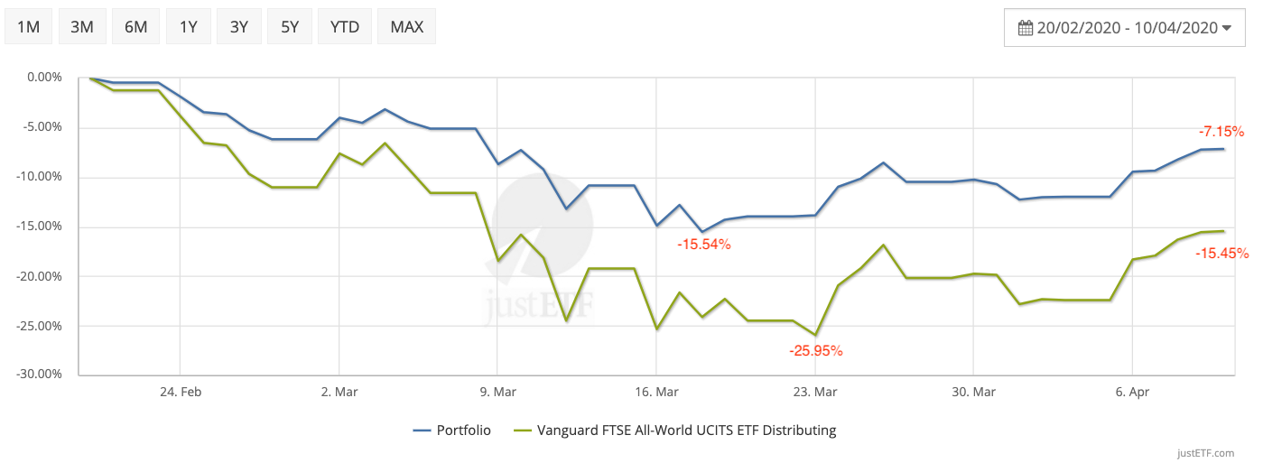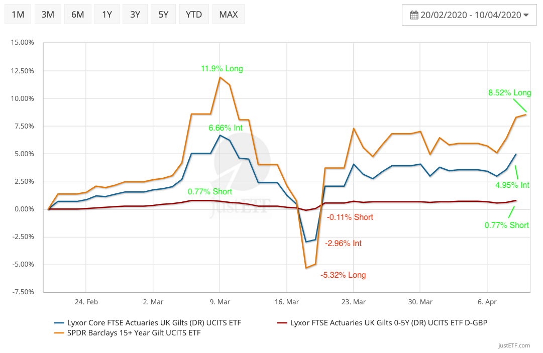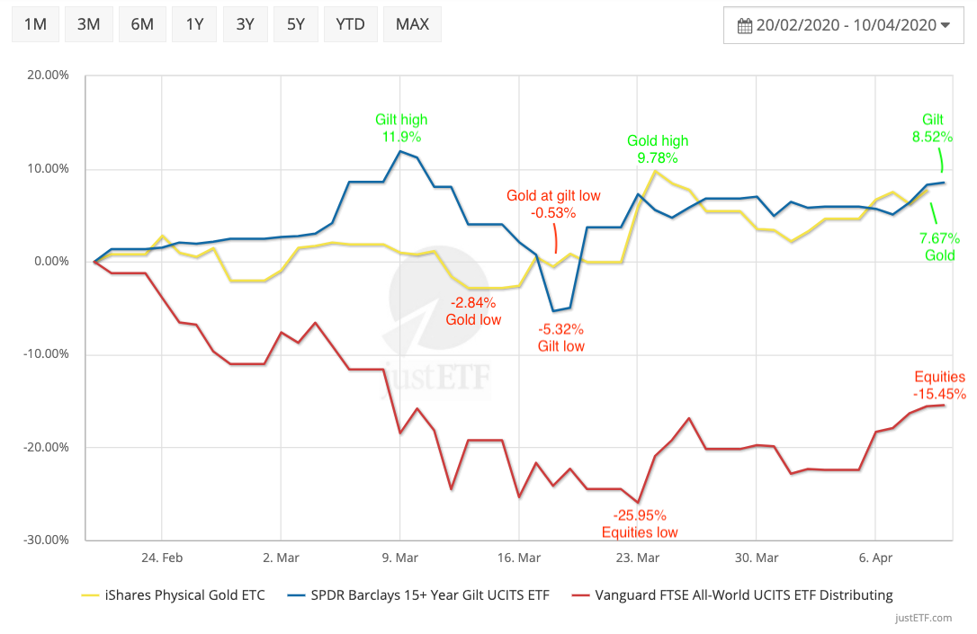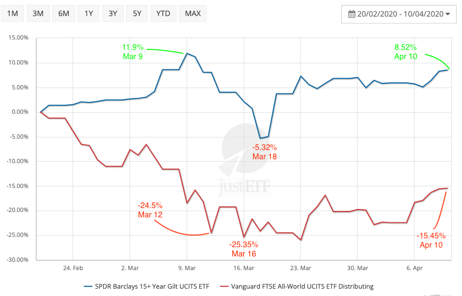 Long-term, high-quality government bonds perform best in a panic. In the chart above you can see how a long-term, UK gilts ETF (GLTL) performed against our global equities ETF (VWRL).