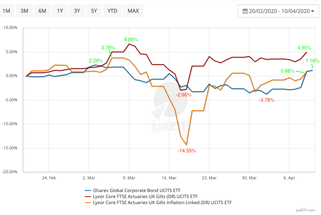 In the first couple of weeks of the crisis, long gilts behaved impeccably. They peaked at 11.9% on 9 March, counterbalancing the slide of equities, even as the Saudis and Russians declared an oil price war. VWRL hit -18.46% on 9 March.