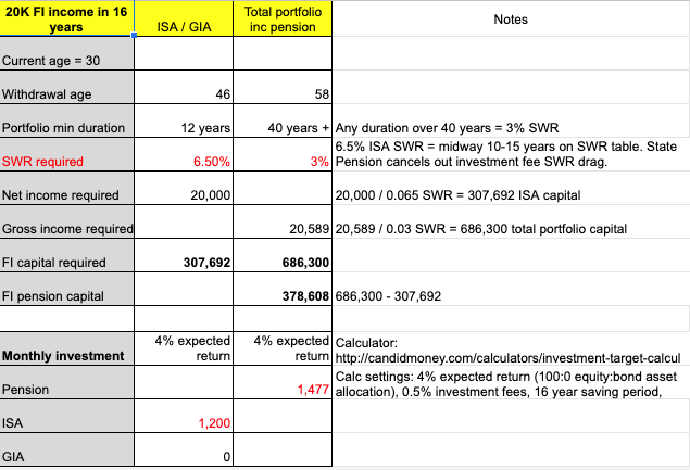But pension isn’t accessible so £307,692 needed in ISAs to retire at age 46 and live on £20K for next 12 years (until pension arrives) at 6.5% SWR.
