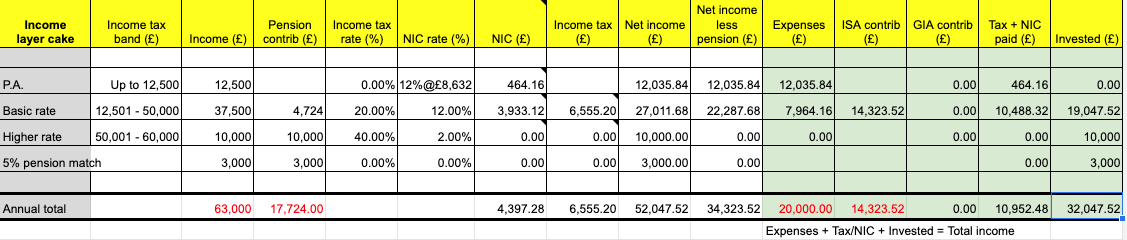 Here’s The Agglomerator’s income layer cake showing how much he will contribute to his pension and ISA, after expenses and tax. (Please click on the picture to see the detail.)