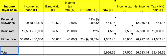 The income layer cake is useful for spotting things that are often overlooked, such as basic rate taxpayers pay 32% tax on income when you include National Insurance Contributions (NICs). Higher rate taxpayers pay 42% tax on income.