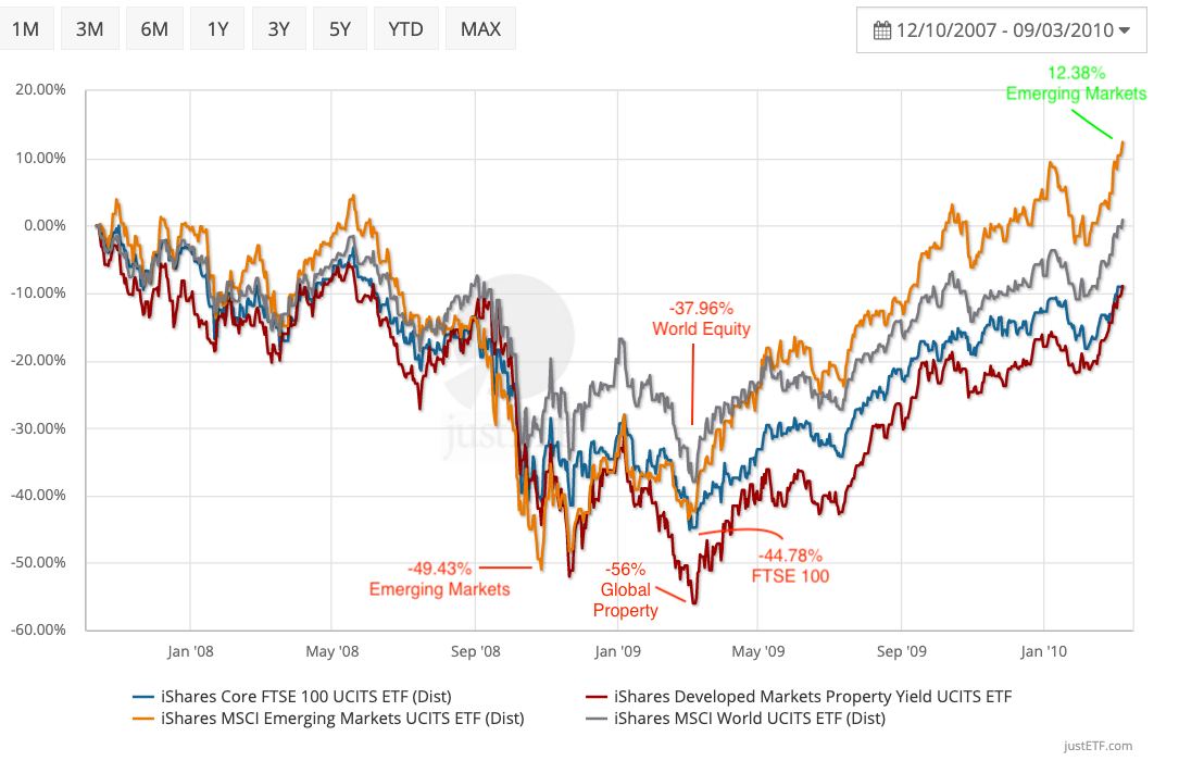 Emerging markets did relatively well initially, again echoing the early stages of the coronavirus crisis. But as the recession took hold from September 2008, the fearsome volatility of emerging markets dunked them down by nearly 50%.