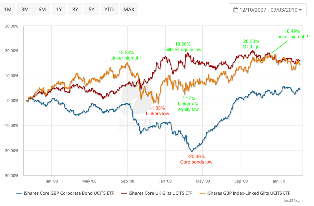 On linkers vs. conventional gilts. The two funds you are comparing, INXG and IGLT, had very different durations (the linker fund INXG being higher than IGLT). Looking at the performance in duration-weighted terms (or using a long duration Gilt fund rather than an intermediate duration one), the outperformance of linkers in 2008 narrows dramatically, and the underperformance over the whole GFC is much larger.