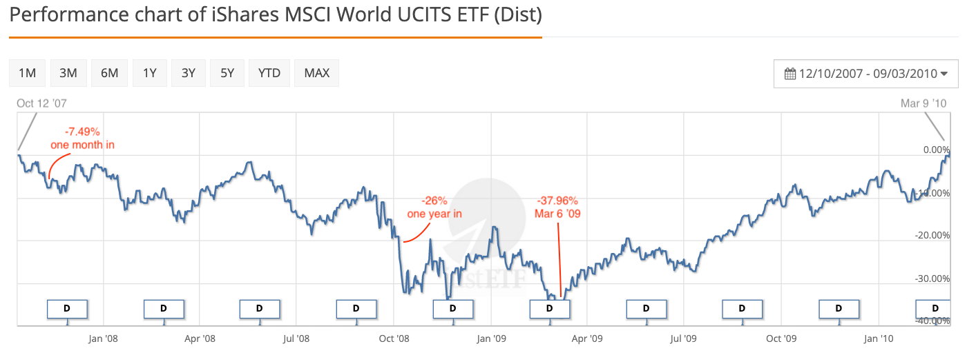 World equities peaked on 12 October 2007. 2 They hit the bottom 17 months later on 6 March 2009.