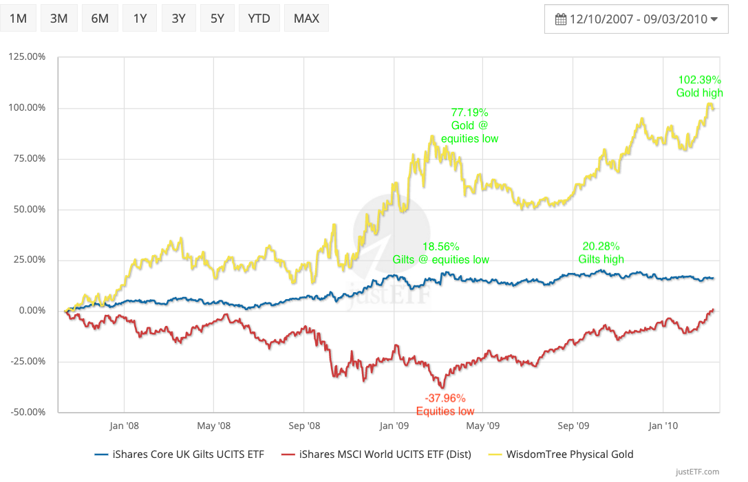 Intermediate gilts (a blend of short, medium, and long-term UK government bonds) lived up to their safe haven billing during the GFC. You can see that gilts were broadly negatively correlated with equities for the duration of the panic. During most of the big equity sell-offs, gilts pitched in the opposite direction as investors sought refuge in safer assets. That’s the famous flight to quality.