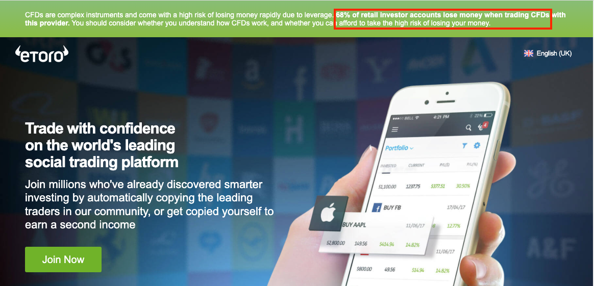 And eToro also says 68% of retail investor accounts lose money when trading CFDs on its site. (At the time of writing).