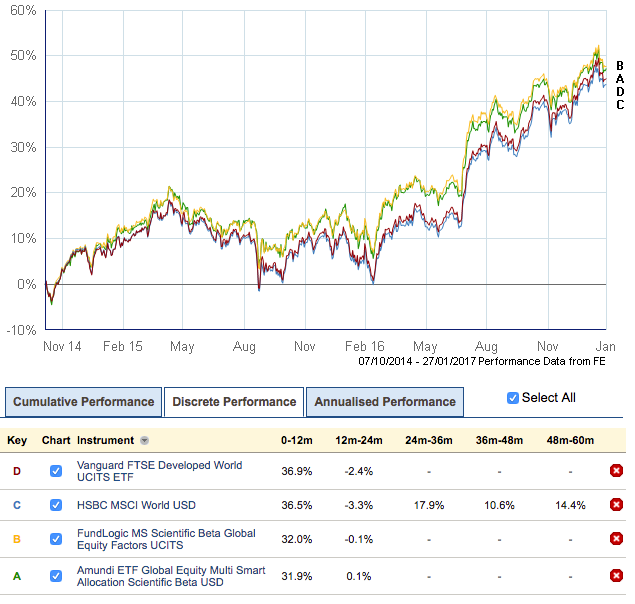 The difference they can make is confirmed by this Trustnet performance chart that matches the last 24-months worth of results from our multi-factor ETFs (A and B) versus two plain, developed world ETFs from HSBC (C) and Vanguard (D).