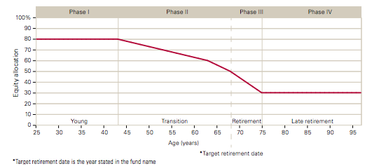 The fund will be split fifty-fifty in 2030. By 2034 it’ll be 40% equities, then 30% equities in 2037 – seven years after reaching its target date.