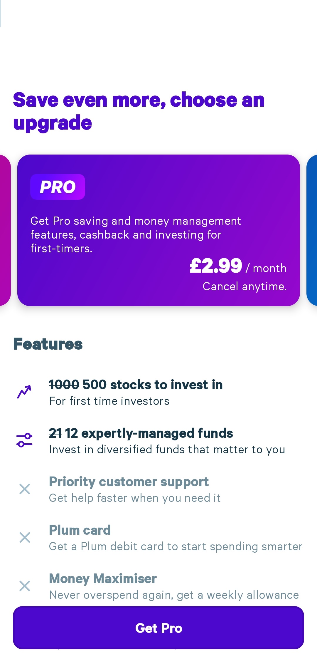Plum ‘Pro’ is £2.99/month, ‘Ultra’ is £4.99/month, and ‘Premium’ is £9.99/month.