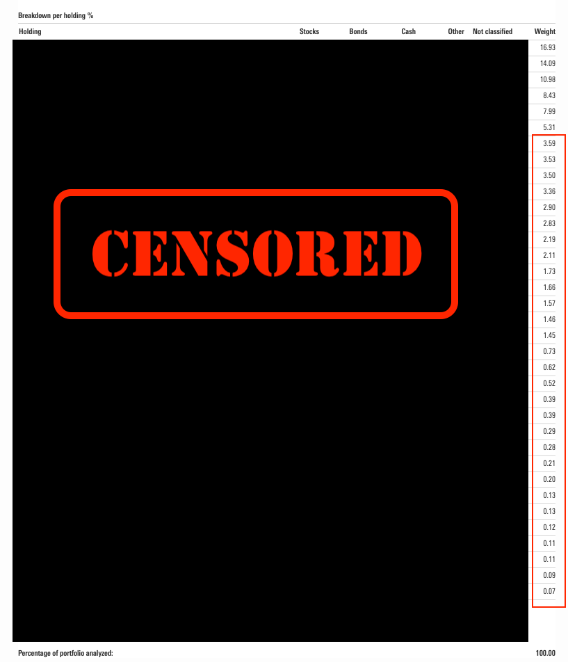 Do not adjust your set! The holding names have been redacted for privacy reasons. The red box shows the majority of holdings make up less than 5% of the portfolio’s weight, while 44% of holdings weigh under 1%. 1 [3]