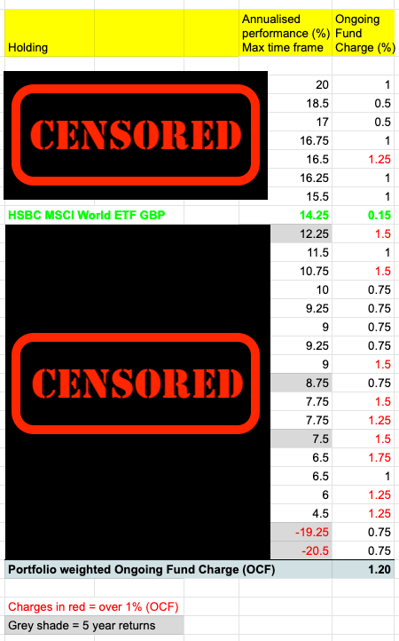 I knew the funds 10-year annualised return in most cases, but where I only had the 5-year return I’ve shaded the cells grey. I’ve rounded the returns and Ongoing Fund Charge (OCF) to the nearest quarter point, except the portfolio’s average OCF.