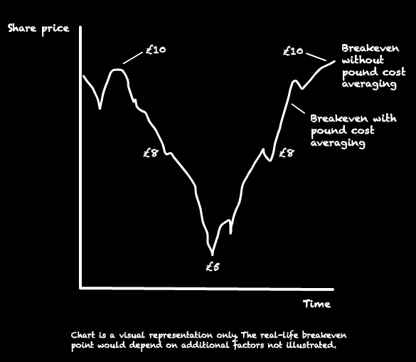 But if you pound-cost average through the crisis then your portfolio breaks even sooner. Your new money registers a profit just as soon as share prices rise above your average buying price – £8.20 a share in the example above.