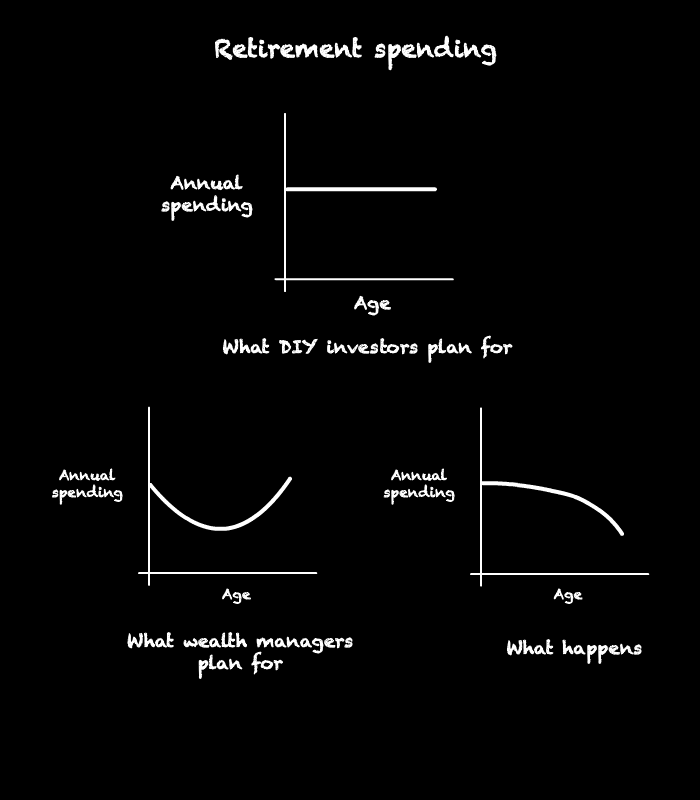 The idea that spending will decline with age is totally dependent on whether someone needs some form of external old age care and what the rules are for other tax payers paying for that care in the location and time where they need it.