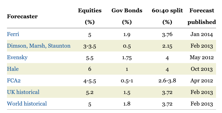 The renowned financial professors don’t say what their forecasted range is, or indicate portfolio composition. I’ve previously seen their forecasts predicated on a 20-30 year range, with developed world equities and 20-year gilts.