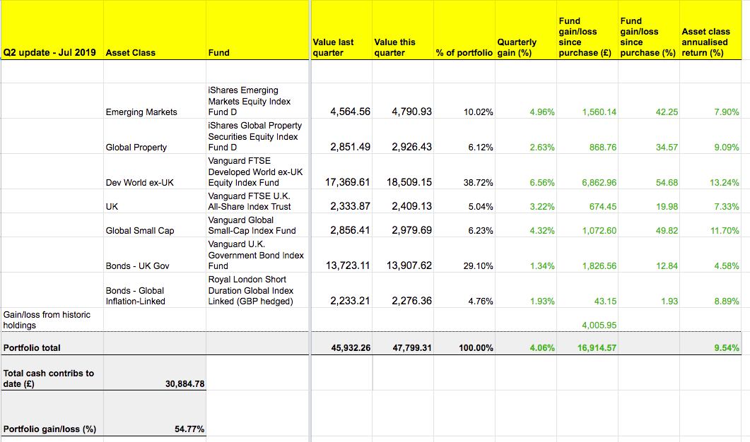 Every quarter we lock £955 into the wicker man of global capitalism and pray for a successful harvest. The virginal cash sacrifice is split between our seven funds according to our predetermined asset allocation.