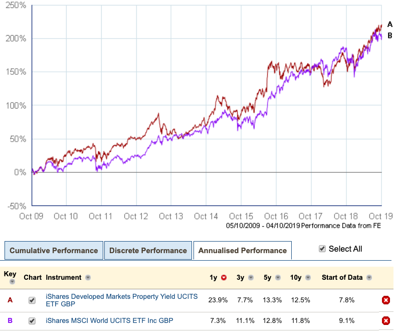 And this Trustnet Chart shows the photo-finish in 10-year returns between iShares Developed Market Property ETF (invests in developed world REIT equities) and iShares MSCI World ETF (invests in developed world equities with just a percent or two in REITs):