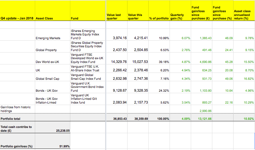 We’ll do that every quarter in 2018, although we’re only putting in £931.73 this time. Why? Because the rebalancing rejiggery equals a £3.27 contribution to Global Small Cap. That’s under our platform’s £50 minimum investment limit, so we’ve written it off for the sake of convenience.