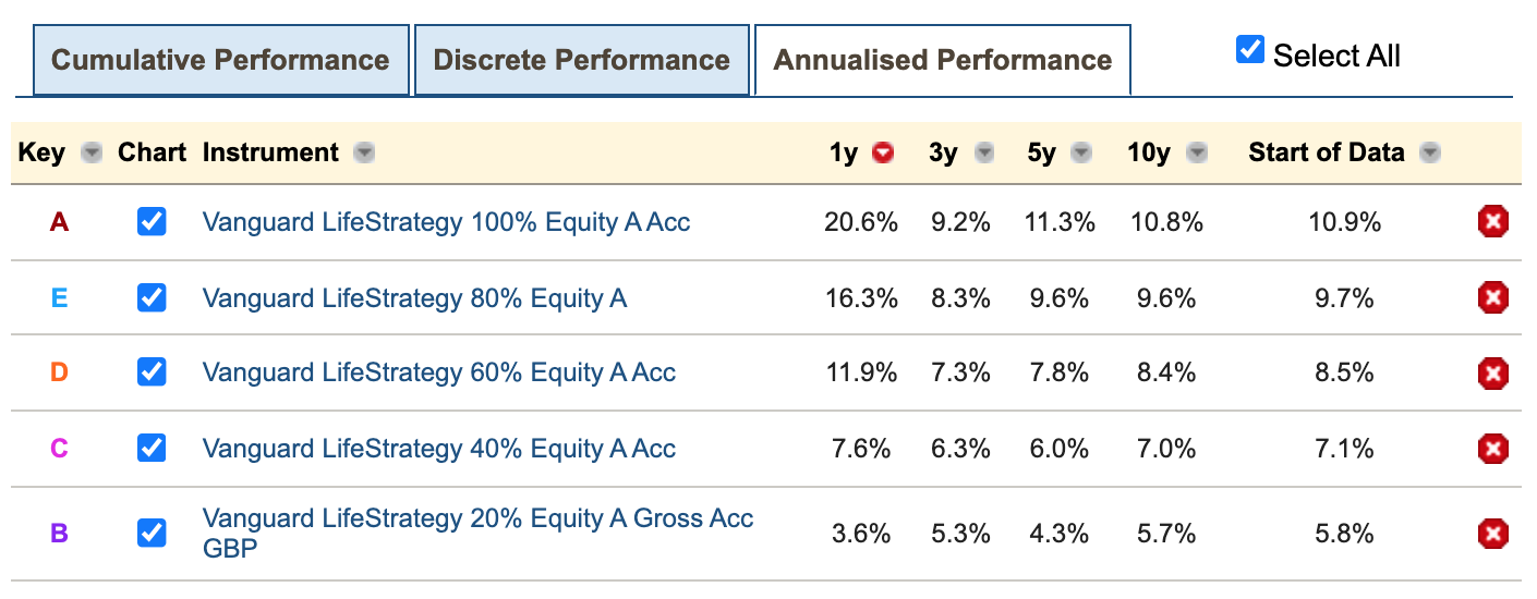 Here’s the 10-year returns for the entire Vanguard LifeStrategy range: