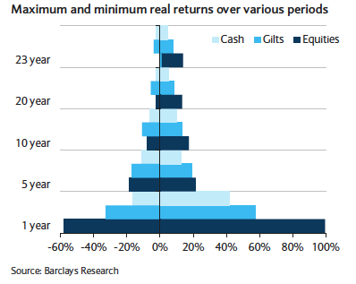 This graph shows the sort of stomach lurching dips you might have to endure in one year of holding equities compared to bonds and cash: